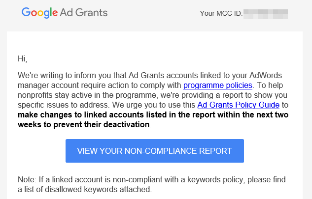 - If Google do send over a non-compliance report stating an infringement in policy, make sure you always look into this, even if you believe the account to be fully compliant. There is always the possibility that you may have miss-checked something or that something has changed recently which is causing Google to flag your account, so always treat this with the utmost importance in order to avoid suspension.