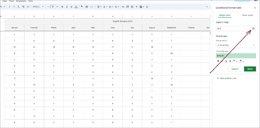 Now, while you’re still in the editor, click on the + Add another rule, just below the Cancel / Done button. It will open another formatting option within the same range.