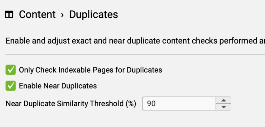 This will open up the Duplicates menu, where you should see the following options. If not already checked, I tick the Enable Near Duplicates option, enabling Screaming Frog to look for instances of almost duplicate content on the site that has a 90% similarity to other content. The Similarity Threshold can be changed as needed.