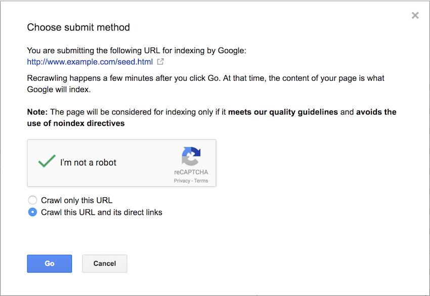 We submitted this seed page, containing the 4 links, to Google using the Fetch as Googlebot tool. We then requested it was indexed and its direct links crawled.