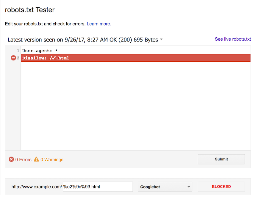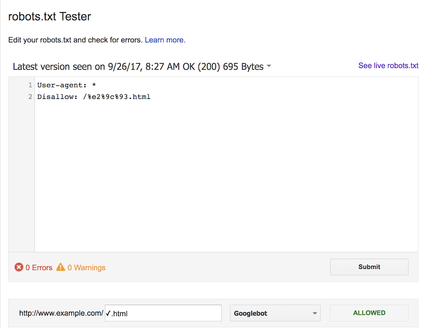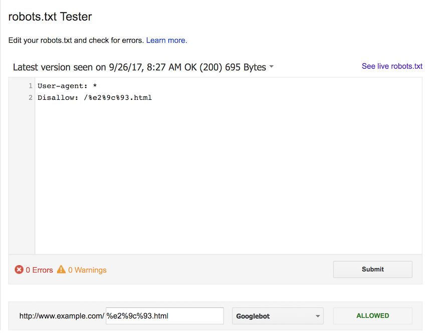 We first tested using the UTF-8 character in the robots.txt file. We checked this against the UTF-8 character, as well as both upper and lowercase percent-encoded versions (%E2%9C%93.html and %e2%9c%93.html).