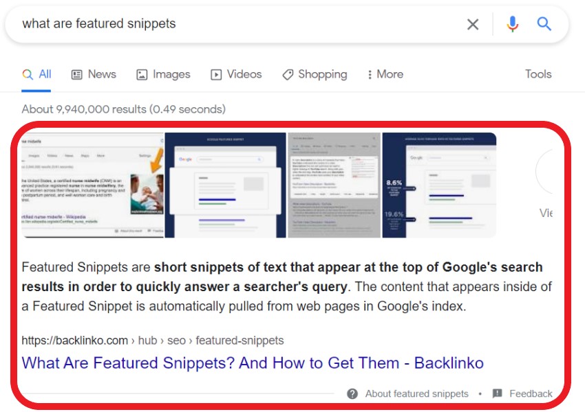 Headings can help a page to target relevant featured snippets (a section of text taken from a page and displayed at the top of the SERP for certain keywords):
