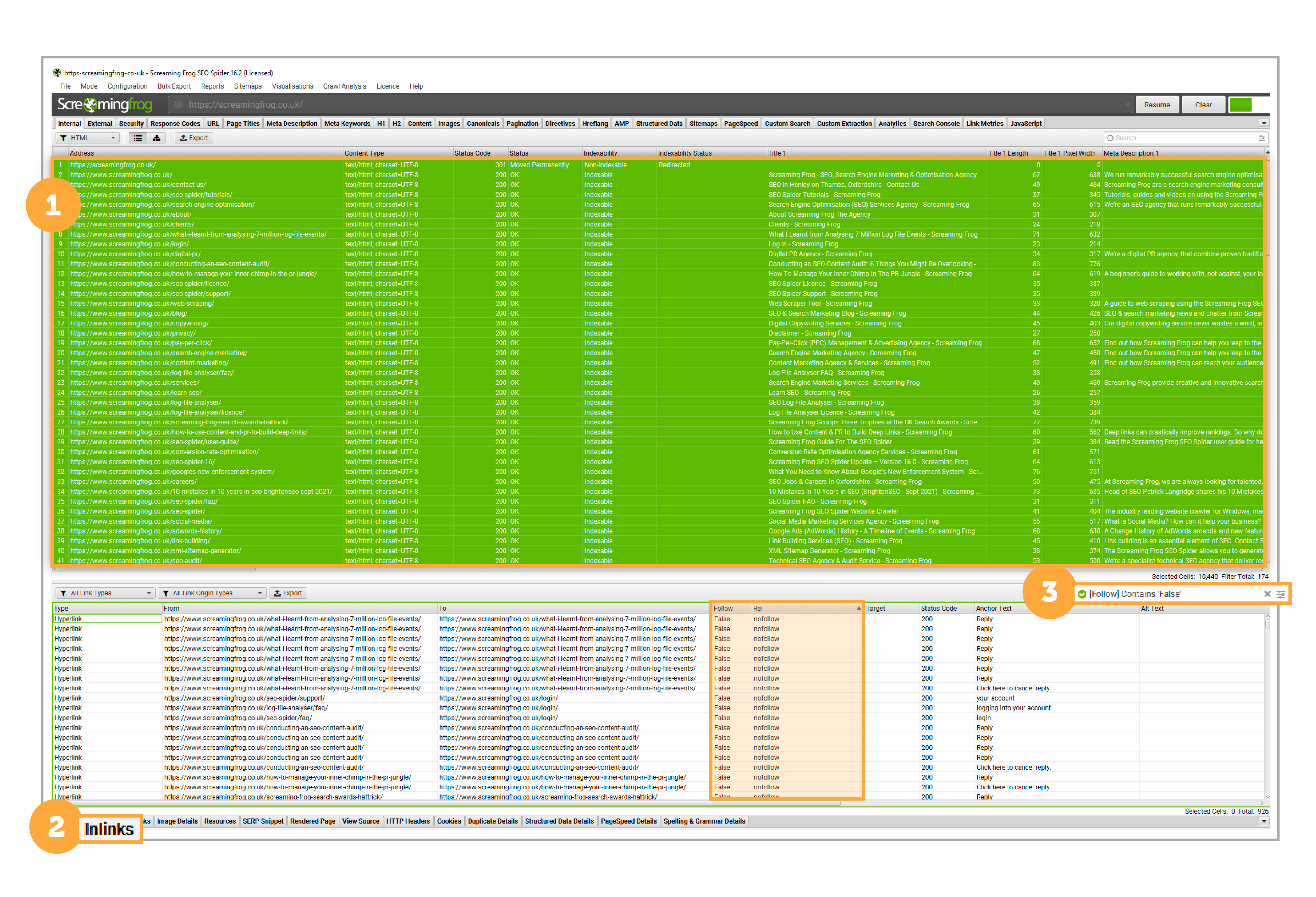 - Filter the Inlinks tab to display links that are either follow or nofollow.