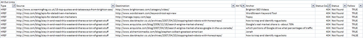 The seed list of URLs uploaded are the source URLs in column B, while their external links which we want to check for broken links are the destination URLs in column C. If you filter the ‘status code’ column, you may see some ‘404’ broken links.