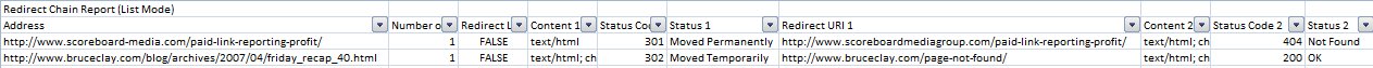 The above contains a URL which 301’s to a 404 and another with a soft 404, a 302 to a 200 response. With this report you can match the ‘address’ URLs in ‘column A’ back to the ‘destination URLs’ and subsequent ‘source URLs’ from your saved 3XX list. Both of the above in this example come from the same blog post for example.