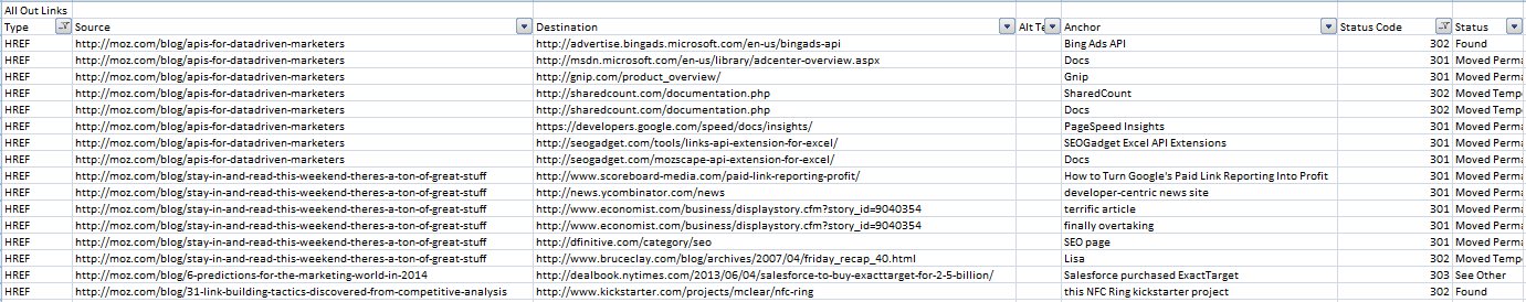 This export will contain all URLs in the list uploaded, as well as their external links and various response codes.
