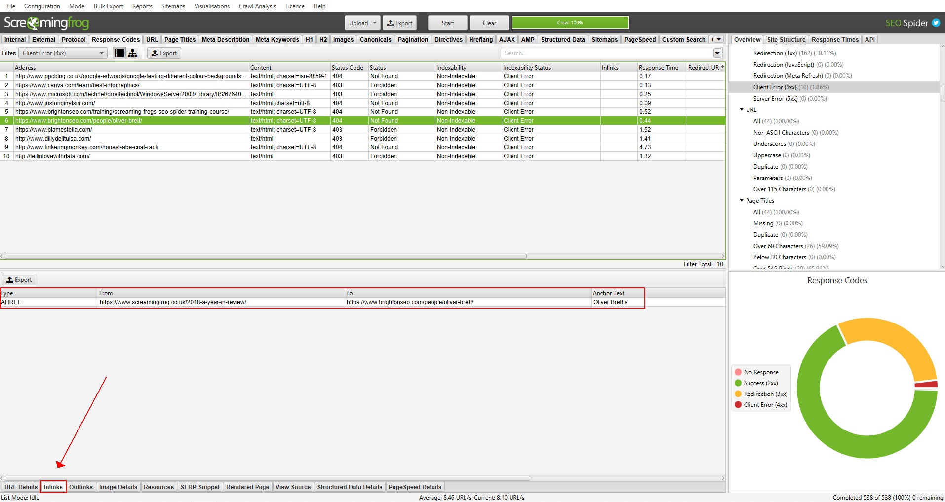To see which page from the original URL list uploaded has the broken links on them, use the ‘Inlinks’ tab at the bottom. Click on a URL in the top window pane and then click on the ‘Inlinks’ tab at the bottom to populate the lower window pane.