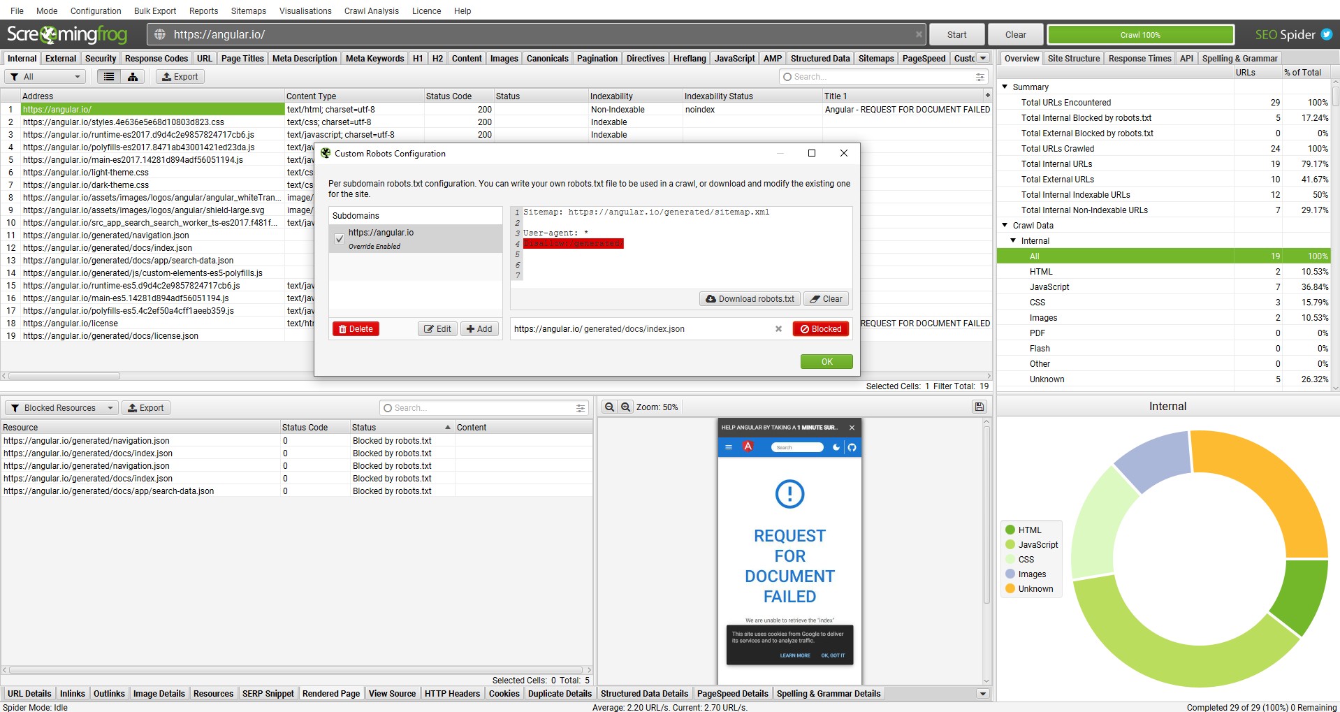 Blocked resources can also be viewed for each page within the ‘Rendered Page’ tab, adjacent to the rendered screen shot in the lower window pane. In severe cases, if a JavaScript site blocks JS resources completely, then the site simply won’t crawl.