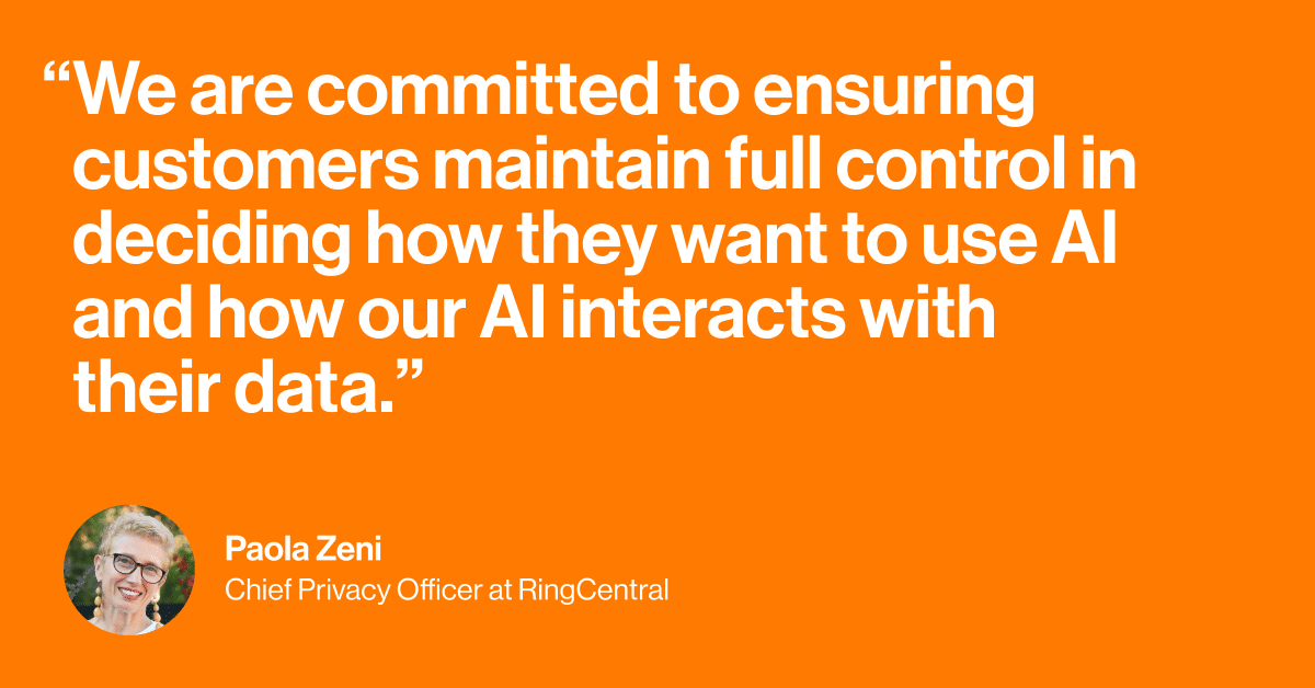 At RingCentral, we take our responsibilities very seriously and our customer’s trust is our top priority. Our proprietary and trusted third-party AI technologies are grounded in our ongoing commitment to privacy, security, and transparency, through privacy by design.